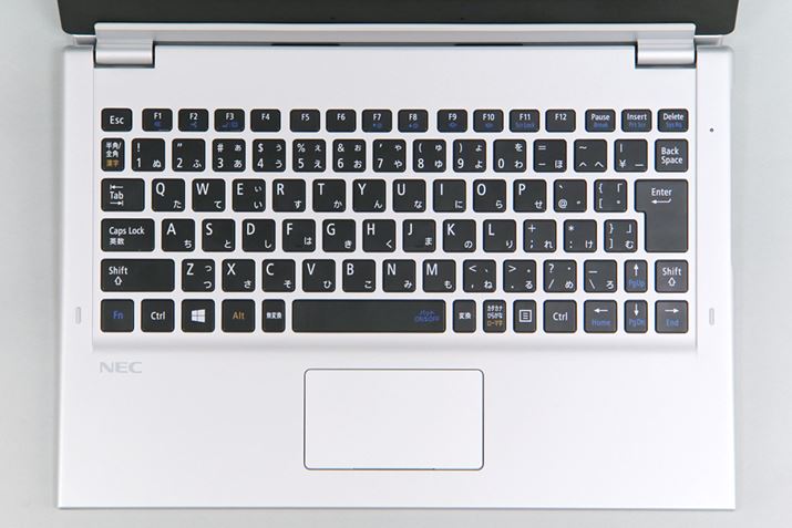「Shift」キーと「ろ」きーの間にカーソルキーの「↑」キーが挟まっているなど、少しクセのあるキーレイアウト。レイアウト自体は13.3型モデルと同じだが、一部のキーは小さくなっている