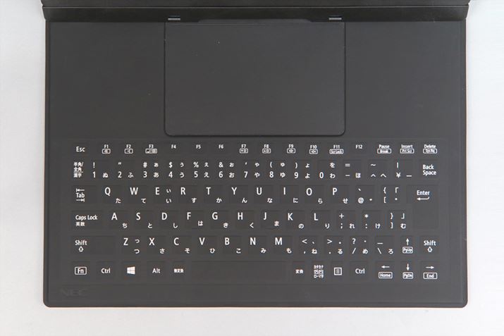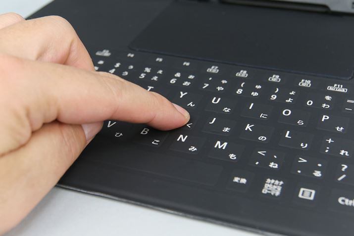 キーボードは13.3型モデルと同じ6列配列だが、キーピッチは17.5mmと少しだけ窮屈だ(13.3型モデルは18mm)。ストロークは13.3型モデルと同じ1.2mm。ストロークが短めで、長時間強めにタイプすると指が痛くなったが、この辺は好みが分かれるところなので、店頭で実際に試してみてもらいたい。タッチパッドはボタン一体型で小さめ。反応がよく、心地よく操作できるが、反応がよすぎて文字入力中に指が少し触るとカーソルが飛んでしまうこともあった。細かい操作をするときは、マウスがあるとよさそうだ。細かな点でいろいろと不満はあるが、2in1タイプの着脱式キーボードとしてはよくできている。