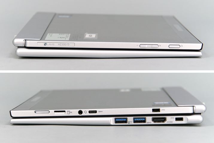 悩ましいのは同じLAVIE Hybrid ZEROの13.3型モデルも、11.6型モデルと同じくらい軽いことだ。タッチ非対応の「HZ550/DAB」は、13.3型の高解像度な液晶を搭載しつつ、約779gとキーボード込みのHZ330/DASよりも軽い。しかも、CPUにCore i5-6200Uを搭載しており、性能も高いので、実に悩ましい選択になりそうだ。実用度は13.3型のほうが高そうだが、持ち歩く頻度が高ければコンパクトでLTE対応のHZ330/DASのほうが満足度は高そうだ。