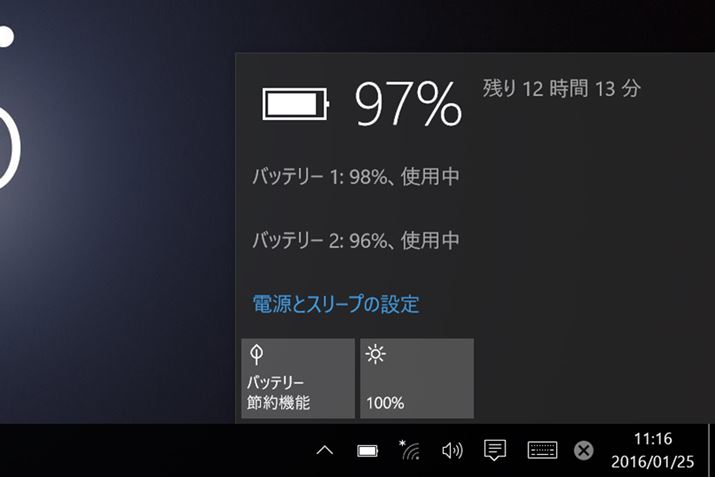 2つのバッテリーの残量は、バッテリー1(本体側)、バッテリー2(キーボード側)と表示される。電源コネクターは本体とキーボードの両方にあるが、どちらにACアダプターを挿してもバッテリー1(本体側)から充電される仕組みだ