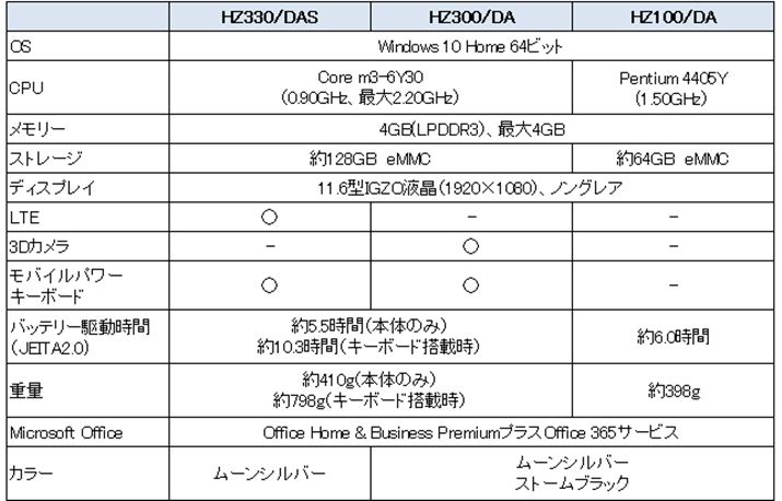 CPUは、HZ330/DASとHZ300/DAがCore m3-6Y30を、HZ100/DAがPentium 4405Yを搭載する。どちらも開発コードネーム「Skylake」と呼ばれるインテルの第6世代CPUだ。開発コードネーム「Broadwell」と呼ばれる旧世代のCPUよりグラフィック機能が強化されている。2in1パソコンやタブレット向けのCPUだが、Atomプロセッサーより性能が高く、Core iプロセッサーより省電力性能がすぐれているのが特徴だ。動作周波数は、Core m3-6Y30が0.90GHzと低いものの、CPUに余力があるときは、ターボブースト機能により最大2.20GHzまで上昇して動作する。Pentium 4405Yはターボブースト機能には対応しておらず、動作周波数は1.50GHz。ストレージはeMMCで、容量はHZ330/DASとHZ300/DAが約128GB、HZ100/DAが約64GBだ。メモリーは3機種とも4GB。ディスプレイは1920×1080の11.6型液晶を搭載する。