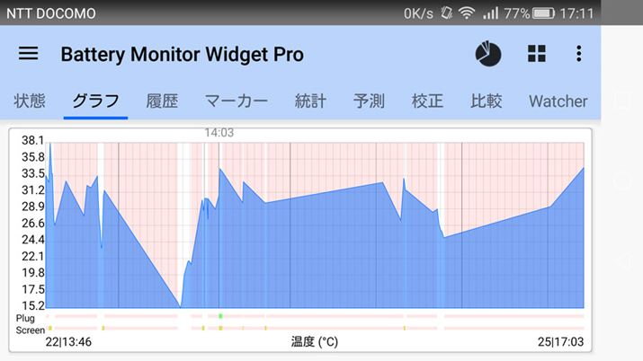 温度の上昇は比較的緩やか。最高温度を記録したのはアプリの更新などで通信を多用したときで38.1度。一般的な使用パターンでは30〜35度台で推移していた