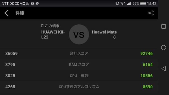 AnTuTuベンチマークを使った本機の総合スコアは36059。最速クラスのMate 8(92746)と比べるとその差はかなりある