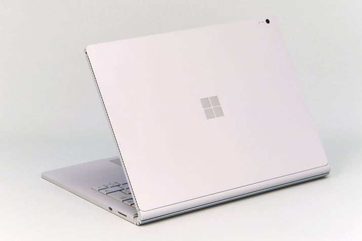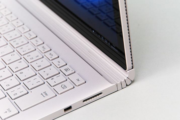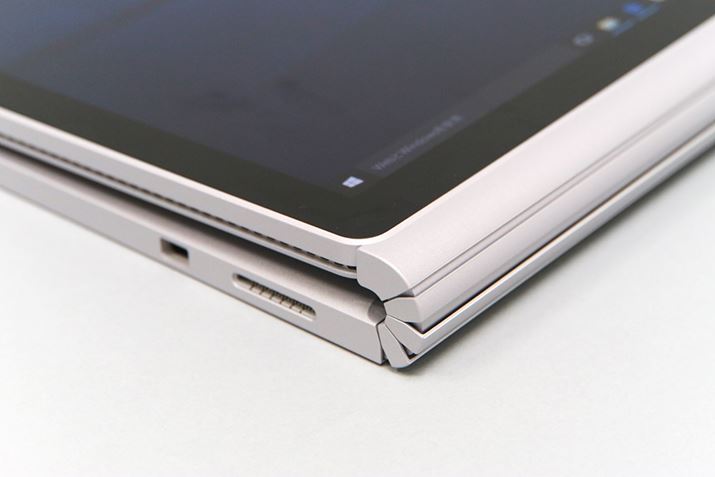 本体は、こだわって作られているのがすぐにわかる。カラーは「Surface Pro 4」と同じシルバー。ライバルであるアップルの「MacBook Pro」よりも明るめのシルバーで、軽やかな印象だ。質感は、サラっとした手触りで、指紋がつきにくい仕上がり。ディスプレイ部分(タブレット)の側面に排熱用の小さな穴がびっしりと並んでいるのが気になるかもしれないが、きれいに処理されており実物ではそれほど気にならないはずだ。デザイン上のポイントはヒンジ部分。上手いたとえが浮かばないが、ダンゴ虫のような面白い動きをする。複数の軸が連動して曲がる仕組みで、独特の動きだ。動きは滑らかだが、一般的な1つの軸のノートパソコンよりも角度を調整するのにある程度力が必要だと感じた。