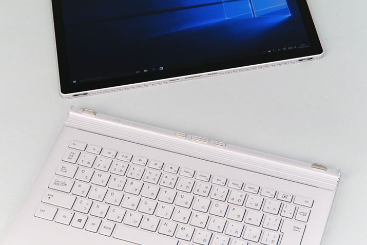 明るめのシルバーで軽やかな印象のSurface Book。軽やかな色味とは逆に、キーボードを含めた重量は約1516g(GPU非搭載モデル)で、モバイルノートPCとしては重い部類に入る