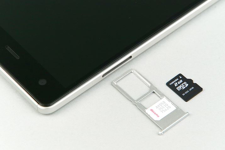 iPhoneなどと同じく、小さな穴にピンを挿して引き出すSIMトレイ。SIMカードはmicroとnanoに対応。2枚のSIMカードを使っても、LTEか3Gで通信できるのは片方だけで、もう一方は日本で利用できないGSMとなる。「設定」から利用するSIMスロットを切り替えられるので、2枚のSIMカードを切り替えて使える。なお、nanoSIMカードを装着するスロットは、microSDカードと共用で、どちらか一方しか利用できない排他仕様だ