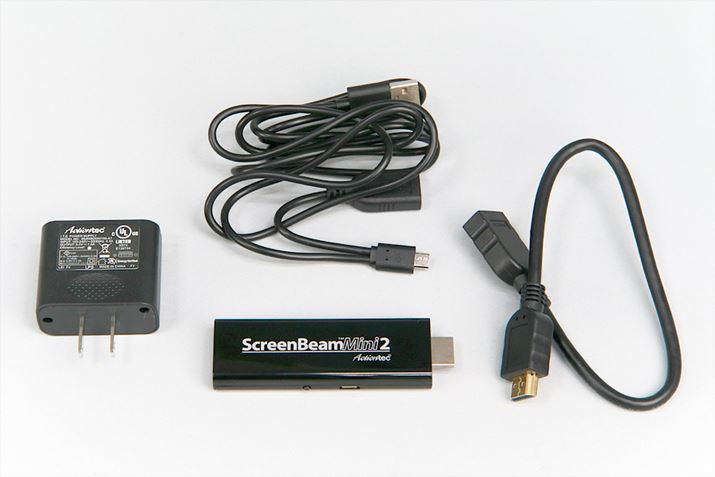 VAIOが動作確認しているアクションテックのワイヤレスディスプレイアダプター、ScreenBeam Mini2 Continuum。価格.com最安価格は10,144円(2016年3月2日時点)。本体のほか、HDMI延長ケーブル、電源アダプター、キーボードなどを接続できるY型のUSBケーブルが付属する