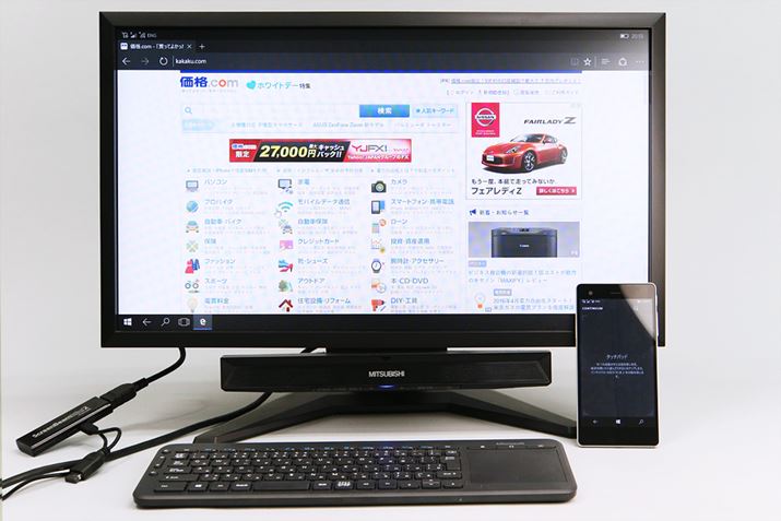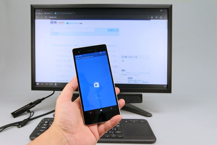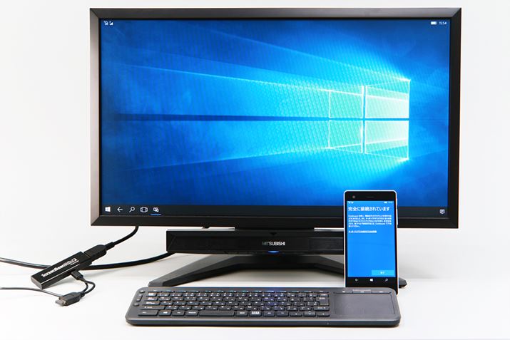 VAIO Phone Bizは、Windows 10 Mobileの目玉機能の1つであるContinuumに対応している。「連続性」「連続体」という意味のContinuumは、外部ディスプレイと接続して、スマホを簡易パソコンとして利用する機能だ。同機能を利用するためには、外部ディスプレイのほかに、ワイヤレスディスプレイアダプターが必要で、同社はアクションテックの「ScreenBeam Mini2 Continuum」を推奨している。セットアップは、ScreenBeam Mini2 ContinuumをディスプレイのHDMI端子に接続し、VAIO Phone BizのContinuum機能を選ぶだけ。スマホの画面に表示される指示に従えば準備はすぐに終わる。接続が確立されるまで、少しだけ待たされたが、問題もなくつながった。無線LANネットワークに接続する必要がないので、出張先のホテルのテレビと接続するといった使い方もできるだろう。