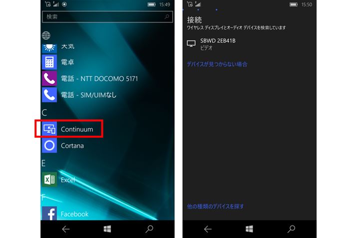Continuumは「すべてのアプリ」から選択できる。セットアップ画面で接続方法として、「ワイヤレスアダプター」を選ぶと、「SBWD SEB41B」が検出され、タップすると接続がスタートする