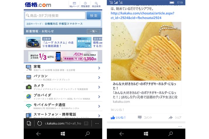 Edgeは、Windows 10パソコンとお気に入りが共有されており、外出先からパソコンでよく閲覧するWebサイトをチェックしやすい(左)。プリインストールされているFacebookアプリ(右)。「超いいね」「うけるね」「すごいね」といった最近追加された「いいね」ボタンが実装されていない