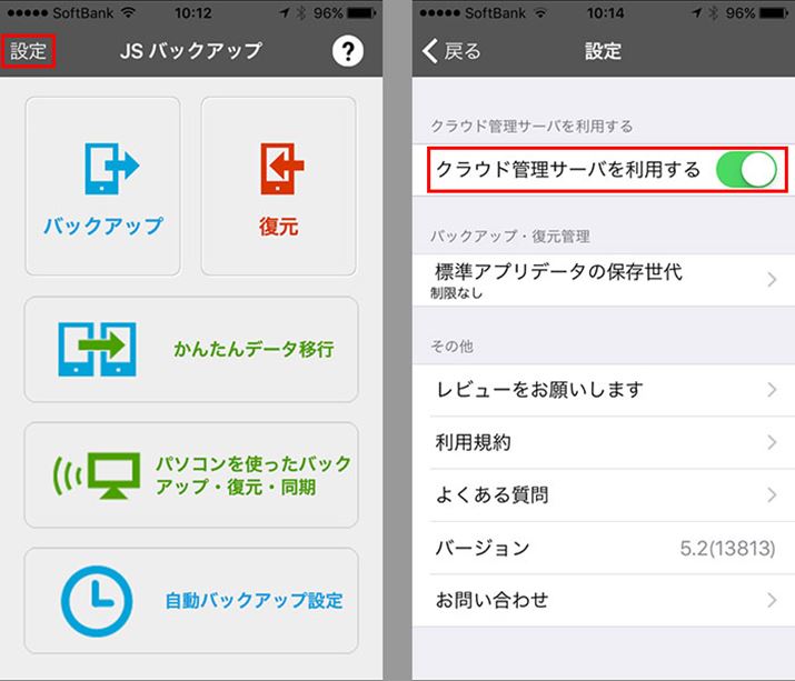 JSバックアップのメニュー画面(左)。左上の「設定」をタップし、移行データをクラウドへ保存するために「クラウド管理サーバを利用する」をオンにする(右)
