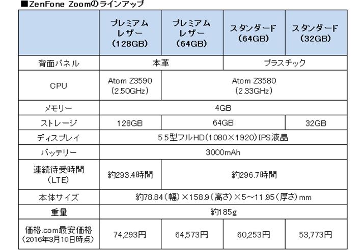 価格.com上では、SIMフリースマホの売れ筋価格帯は2万円台〜3万円台だが、今回試した最上位モデルの価格.com最安価格は74,293円(2016年3月10日時点)と、かなり強気の価格設定となっている。ストレージがスマホとしては大容量の128GBで、光学3倍ズーム対応のカメラを搭載していることを考えると妥当と言えるかもしれないが、なかなかインパクトのある価格だ。一番安価な32GBモデルでも価格.com最安価格は53,773円なので、“光学3倍ズーム代”をどう判断するのかが購入するかどうかの分かれ目になりそうだ。