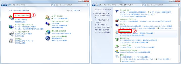 「コントロールパネル」を開く。Windows 7ならスタートメニューで「コントロールパネル」をクリックして開き、そこで「システムとセキュリティ」(1)→「Windows Update」(2)の順にクリックする