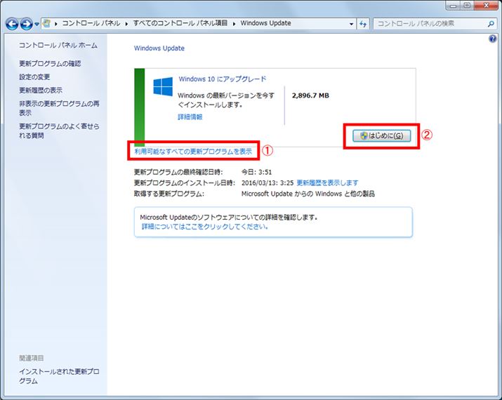 「利用可能なすべての更新プログラムを表示」(1)をクリックする。「はじめに」(2)をクリックしないように気をつけよう