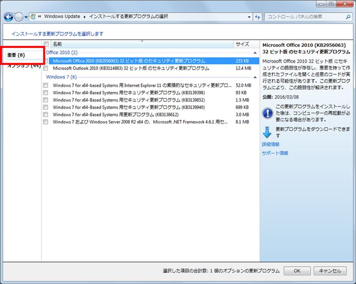 更新プログラムが一覧表示される。左側の「重要」タブをクリックすると、「重要な更新プログラム」が表示される。これは、バグや脆弱性の修正などWindowsにとって重要な更新だ。これらは基本的にチェックを入れてインストールしたほうがよい