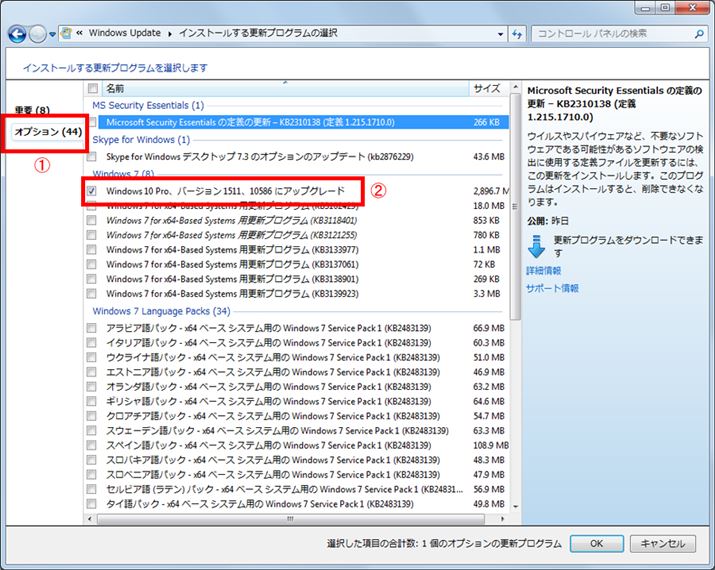 左側の「オプション」タブ(1)をクリックすると、重要ではないがインストール可能な更新プログラムが表示される。ここにWindows 10にアップグレードする項目が表示されてチェックが入っていたら、まずチェックを外そう(2)