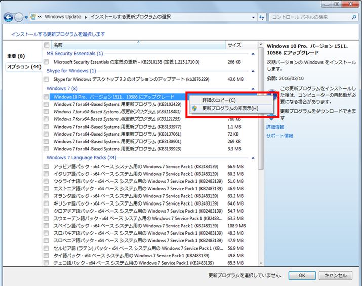 先ほどの画面が再び表示されるが、Windows 10にアップグレードする項目が、チェックを外した状態でまだ残っている。これを右クリックして、表示されるメニューにある「更新プログラムの非表示」をクリックすると、項目がグレーアウトして消える