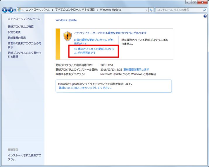 再びWindows Updateのトップ画面に戻ると、「●個のオプションの更新プログラムが利用可能です」の数字が減っていることがわかる