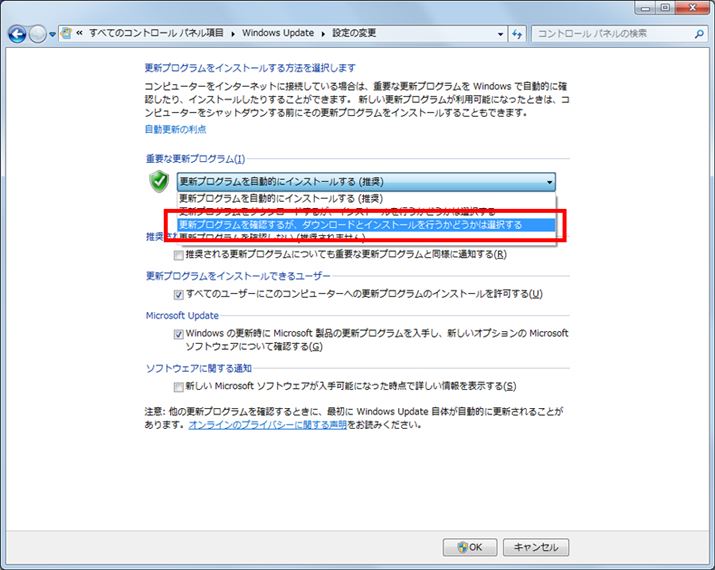 設定画面が表示される。「重要な更新プログラム」のプルダウンメニューをクリックして開き、「更新プログラムは確認するが、ダウンロードとインストールを行うかどうかは選択する」を選ぶ