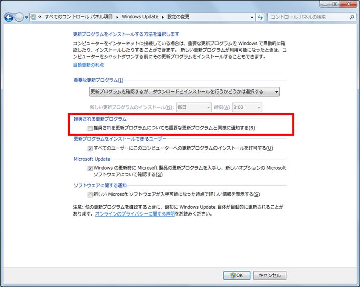 その下にある「推奨される更新プログラムについても重要な更新プログラムと同様に通知する」のチェックも外しておくと安心だ