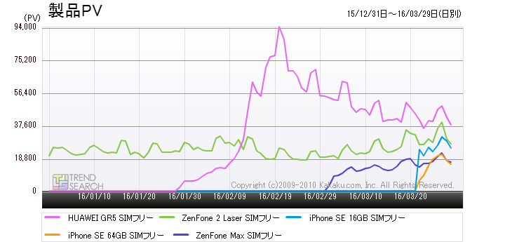 図6は、「スマートフォン」カテゴリーにおける人気5製品のアクセス推移を示したものだ。約1週間前に発表されたばかりの「iPhone SE」シリーズでは、上記のSIMフリーモデル・2機種がベスト5内にランクインしているが(3月30日時点で、SIMフリー16GBモデルが2位、SIMフリー64GBモデルが3位)、現在1か月以上も首位をキープしているHuawei「GR5」の人気は超えられていない。また、ひと足早く3月2日に発表され、中旬より発売されているASUS「ZenFone Max」の人気も高まってきており、「iPhone SE」からすると決して楽観視はできない状況にある。驚くべきは、これらベスト5製品がすべてSIMフリーモデルであるという点。すでにSIMフリー化が本格化していたAndroid勢はもとより、iPhoneにもいよいよSIMフリー化の波が本格的に訪れたといってよさそうだ。