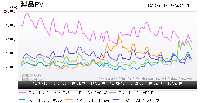 では、メーカー別に見た場合の「iPhone SE」のインパクトはどうだったか。図2は、過去3か月の「スマートフォン」カテゴリーにおける主要5メーカー別アクセス数の推移を推移を示したもの。これを見ると、2016年初頭の段階では、「Xperia」シリーズが好調のソニーがトップを走っており、他のメーカーと大きな差をつけていたが、徐々にその人気が下がってきていることがわかる。2月下旬には、「GR5」が好調な人気を博しているHuaweiに迫られるが、その後も、ソニーが首位を守り続けている状況だった。しかし、3月22日の「iPhone SE」の発表によって、それまで3〜4位の間を漂っていたアップルのアクセス数が2倍以上に伸び、一時的に首位のソニーを抜き去る場面も見られた。しかし、その伸びも1日程度で、再びソニーが首位に返り咲き、アップルは2位に留まるという状況となっている。明日3月31日の発売日以降に伸びる可能性はあるが、現状では、首位のソニーを覆すほどのインパクトとはなっていない。