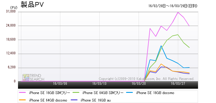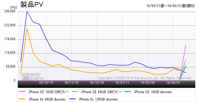 2016年3月22日(日本時間)未明に、アップルから発表された新型スマートフォン「iPhone SE」。「iPhone 5」シリーズと同じ4インチ液晶のスクエアボディに、最新モデル「iPhone 6s」並みのハードウェアを内蔵させた、いわば「小さな巨人」的なモデルと言える。明日、3月31日に発売となる本製品だが、製品発表から約1週間、ユーザーはどういった反応を示したのだろうか。「価格.comトレンドサーチ」のデータから検証する。
