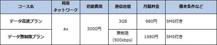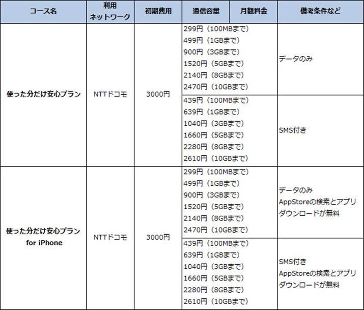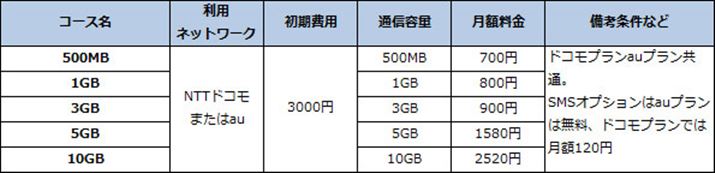 なお、料金はいずれも共通だが、auプランについてはSMSのオプションが無料で、いっぽうのドコモプランについては月額120円の料金がかかる点が異なる。