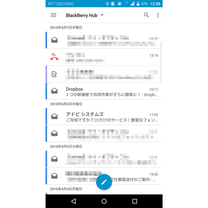 各種のメールや、SNSの通知、電話の発信・着信履歴をまとめて管理できるBlackBerry Hub。こちらは今のところ本機専用のアプリとしてGoogle Playで取り扱われている