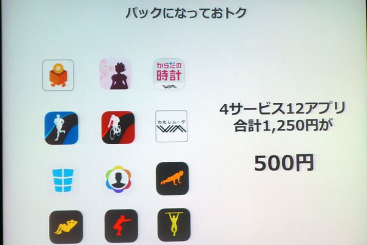 同時に発売された「dヘルスケアパック」は、上述の「歩いておトク」、別売りの各種ライフロガーが集めた活動量情報をもとに健康管理や提案を行う「からだの時計」(月額300円・税別)、生理周期など女性向けの健康管理を行う「カラダのキモチ」(月額300円・税別)、より本格的な運動管理を行う「Runtastic for docomo」(月額350円・税別)をパックにしたメニューで、月額1,250円相当のアプリを、半額以下の月額500円で利用できるというもの。これらのうちの2つ以上を利用すれば元が取れるため、かなり魅力的な価格設定といえる。
