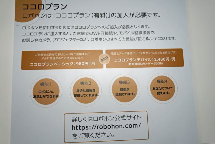 「RoBoHoN」での会話を楽しむためには、オプションサービスの「ココロプラン」に加入することが必要。月額980円のベーシックな「ココロプランベーシック」に加えて、月間3GBの通信が可能な音声通話付きSIMカードがセットになった「ココロプランモバイル」も用意される。こちらは月額2,480円(いずれも税別)だ