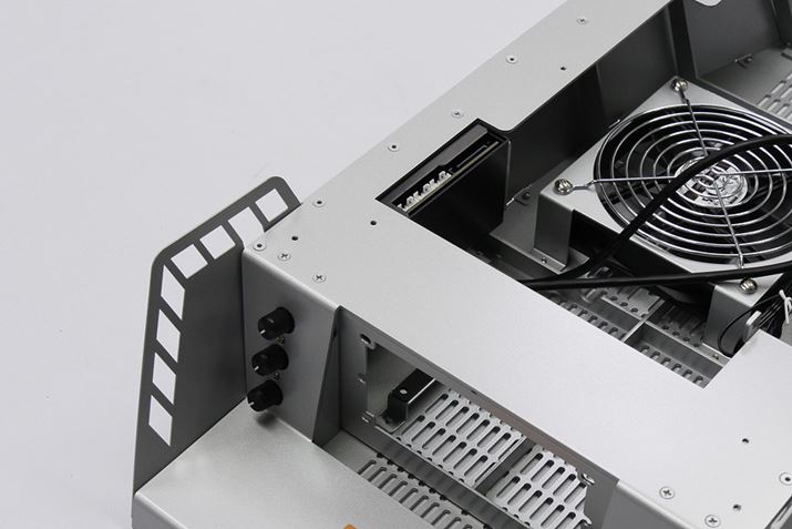 船首にはHDD/SSD用のドライブケージが用意されている。ドライブケージには、3.5インチHDD×2台、2.5インチSSD×2台の最大4台が搭載できる