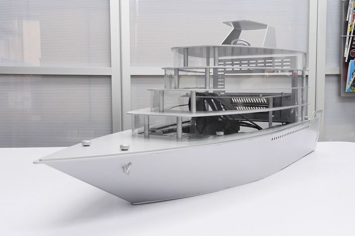 外観はいわゆるヨットというよりクルーザーといった感じ。デッキより上の側面部には無色透明のアクリルパネルが装着されており、中が見えるようになっている。まさにゴージャスな作りだ