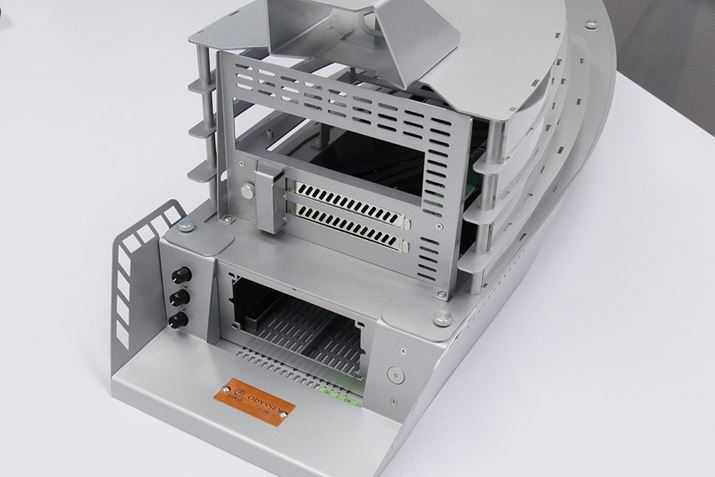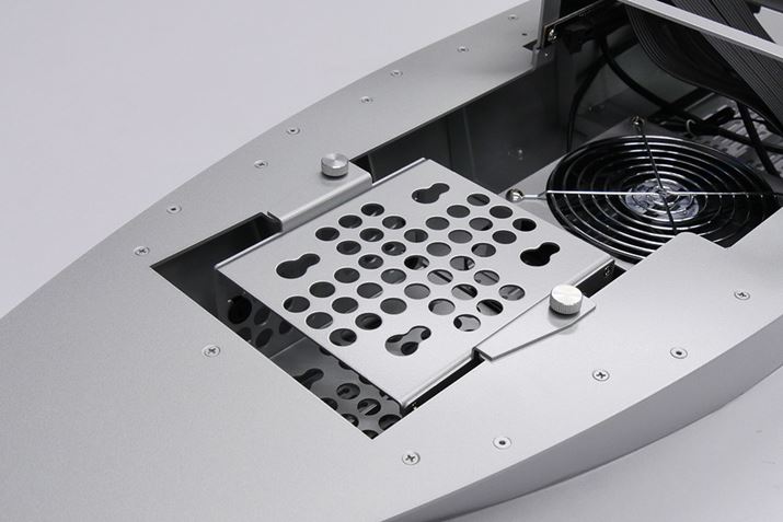 対応マザーボードはMini-ITXで、搭載できる電源ユニットはSFX規格。拡張カードスロットは2基備えている。なお、手前に見えるブロンズ色のプレートにはシリアルナンバーが記されている