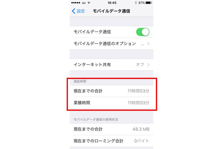 iPhoneの場合、「設定」→「モバイルデータ通信」から通話時間を確認できる。ただし、これはあくまで目安。詳しくは各キャリアの明細を確認したい