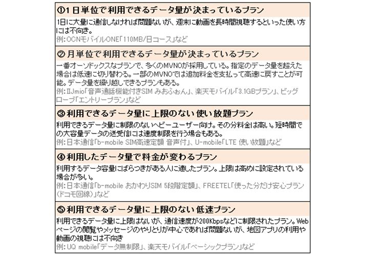 今回はMVNOの詳細については解説しないが、格安SIMの料金プランは、大まかに5つのタイプに分けられる。同じMVNOであれば、プランを無料で変更できるケースが多いので、利用しながら自分に合ったプランを見極めていけばいいだろう。