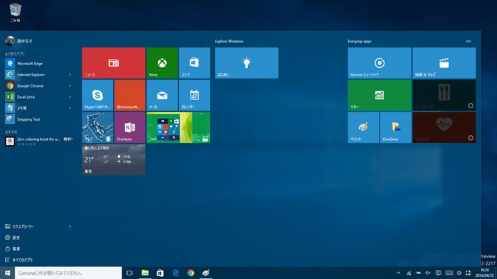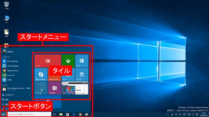 タスクバーの一番左にあるスタートボタンをマウスの左ボタンでクリックすると、スタートメニューが表示される。「Windows 95」以来の伝統だ。スタートメニュー右側に表示されているソフトのアイコンは、タイルと呼ばれる