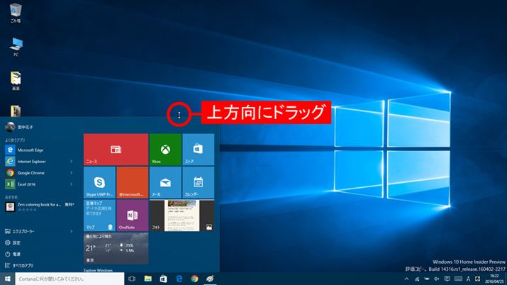 スタートメニューの一番外側にマウスカーソルをあわせると、カーソルの形が両矢印の形になる。この状態でドラッグすると、スタートメニューを拡大・縮小できる。縦・横どちらの向きでもOKだ。