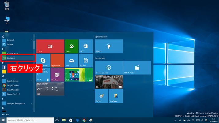 スタートメニューで、登録したいソフトのアイコンを右クリックする。ここでは「Excel 2016」のアイコンを右クリックする