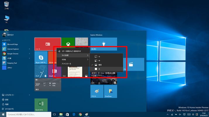 タイルを右クリックして「サイズ変更」を選ぶと、タイルの大きさを変えられる。ソフトによって選べるサイズの種類は異なる。ちなみに、Excel 2016のタイルは小・中の2種類しか選べない