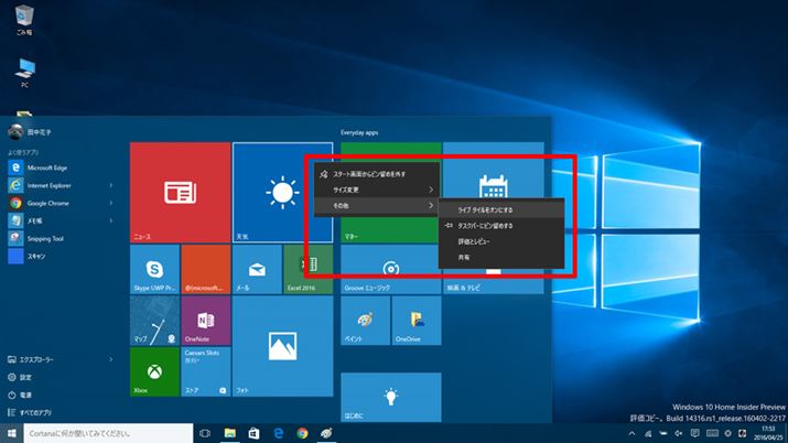 ライブタイル機能は、ソフトが定期的に最新情報を取得して、それをタイルに自動的に表示する機能だ。Windows 10の標準アプリだと「メール」「ニュース」「マネー」「天気」「フォト」などが対応している。この機能はオン・オフできる。