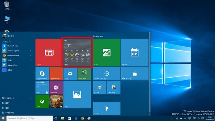 オンにすると、自動的に最新情報を取得してタイルに表示されるようになる。天気の場合は、週の天気が表示される。同機能をオンにすると、スタートメニューを開くだけで天気やニュースなどがわかる