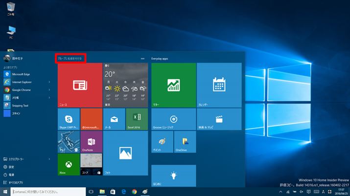 スタートメニューの右側にあるタイルはグループごとに仕分けられていて、そのグループに名前を付けられる。グループ名の部分をドラッグすると、タイルを移動させる時のように、グループごとに移動できる。