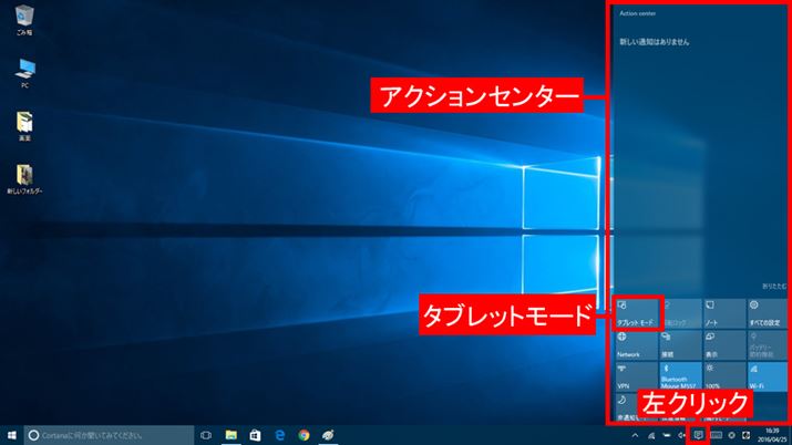 タスクバー右端のアイコンをクリックして「アクションセンター」を開き、「タブレットモード」をクリックすると、全画面のスタート画面が表示されるようになる