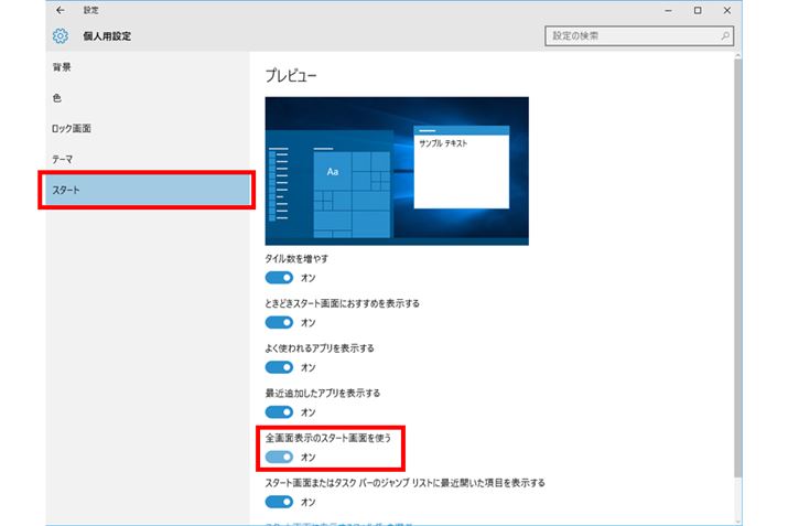 「個人用設定」画面の左側の項目で「スタート」をクリックする。右側にスタートメニューの設定項目が表示されるので、「全画面のスタート画面を使う」をクリックしてオンにする