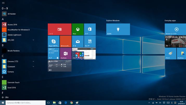 Windows 10では、スタートメニューを全画面表示にして、Windows 8/8.1のスタート画面風にすることも可能だ。「アクションセンター」で「タブレットモード」を選ぶと全画面表示になるが、これはタブレット用の機能なので、アプリも全画面でしか使えない。