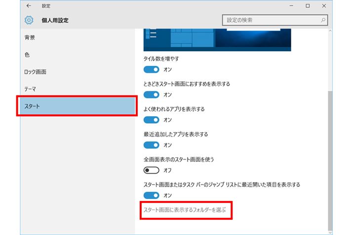 「個人用設定」の左側の項目で「スタート」をクリックする。右側にスタートメニューの設定項目が表示されるので、一番下にある「スタート画面に表示するフォルダーを選ぶ」をクリックする