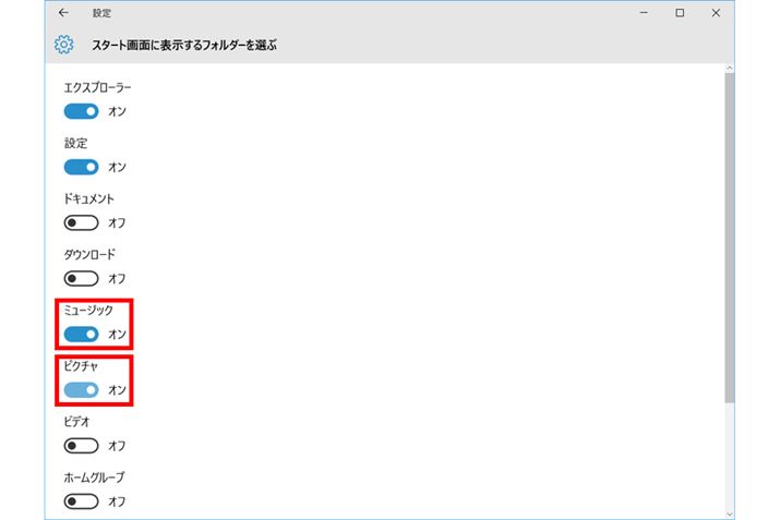 スタート画面に表示させたいフォルダーを選んで、クリックして「オン」にする。ここでは「ミュージック」と「ピクチャ」をクリックしている。ちなみに、よく利用する「エクスプローラー」と「設定」は初期状態でオンになっている
