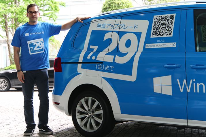 Windows 10の無償アップグレード期限が2016年7月29日で終了する。無償アップグレード期間の終了日を告知するために全国10都市以上を回るキャラバンカーと日本マイクロソフトの平野拓也社長