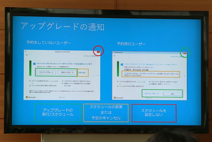 もちろん、すぐにWindows 10へアップグレードする必要はなく、アップグレードの通知が表示されても、画面を閉じればアップグレードのスケジュールは設定されない。互換性に不安がある場合は、ソフトや周辺機器の対応状況を確認してアップグレードするかどうかを判断するといいだろう。なお、同社によると、7月29日の何時まで無償でアップグレードできるのかは現時点で未定ということなので、遅くても前日の28日までにはアップグレードを済ませておくと安心だ。無償アップグレード期間の延期は、現時点では「ない」(平野社長)としている。